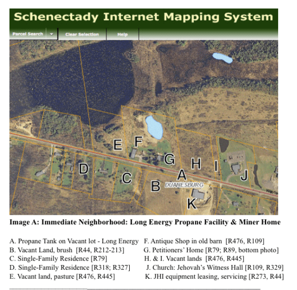 When Bill and Cyndi Miner bought their home in 1999, their parcel and all the lands across the street were zoned “Agricultural-Residential”. In 2001, Duanesburg superimosed a C-1 Commercial zone 500-feet deep along both sides of Western Turnpike. Patrick Barnes, the Planning Board Member who chaired the public hearing on Long’s special use permit and rushed through the unanimous vote a few minutes after the hearing ended, swore in his affidavit to the court that the neighborhood is already “predominantly commercial.” In fact, there are mostly residences and agricultural or vacant lands in the immediate neighborhood of the propane tank and the Miners’ home, plus a church.