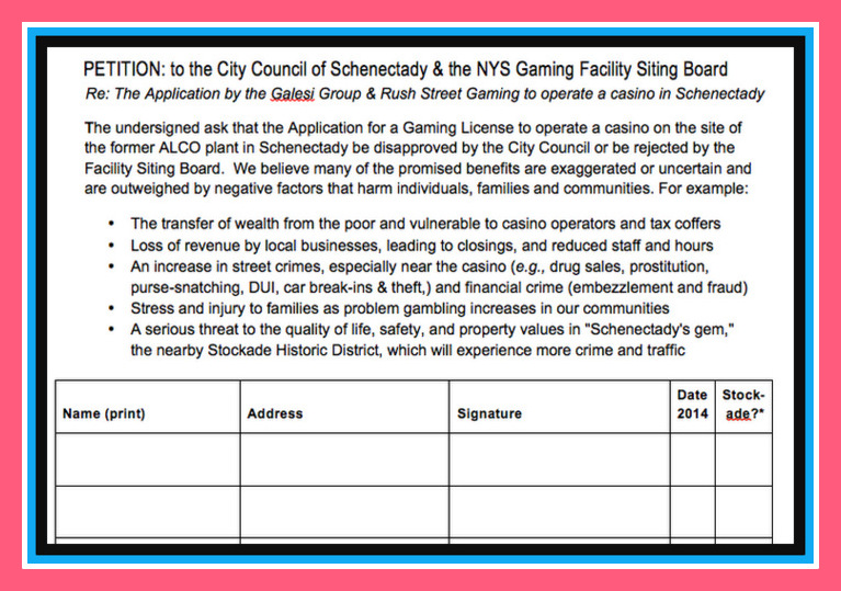 Many thanks to all who came to show their support of the No Casino campaign, and to those helped organizing and putting on the Meeting: Richard Genest, our host at Arthur’s Market; Donna Lagone and Jessie Malecki, who did most of the work of circulating the petition in the Stockade; Mohamed Hafez, who physically got the petition to churches and businesses on his side of town, and spurred on the No Casino campaign with his energy and writing skills; and Tom Hodgkins, who made signs and decorations, but also crunched numbers to show us the strength of the opposition in Schenectady County, and brought along his best reasons for wanting to preserve and improve Schenectady, his three great kids.