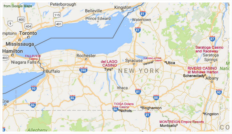 In an Appendix at the bottom of this posting, I have compiled the distances of the various casinos from Albany, Binghamton, Buffalo, Ithaca, Kingston, Rochester, Syracuse, Watertown, and Utica. Here are the distance figures for Syracuse: