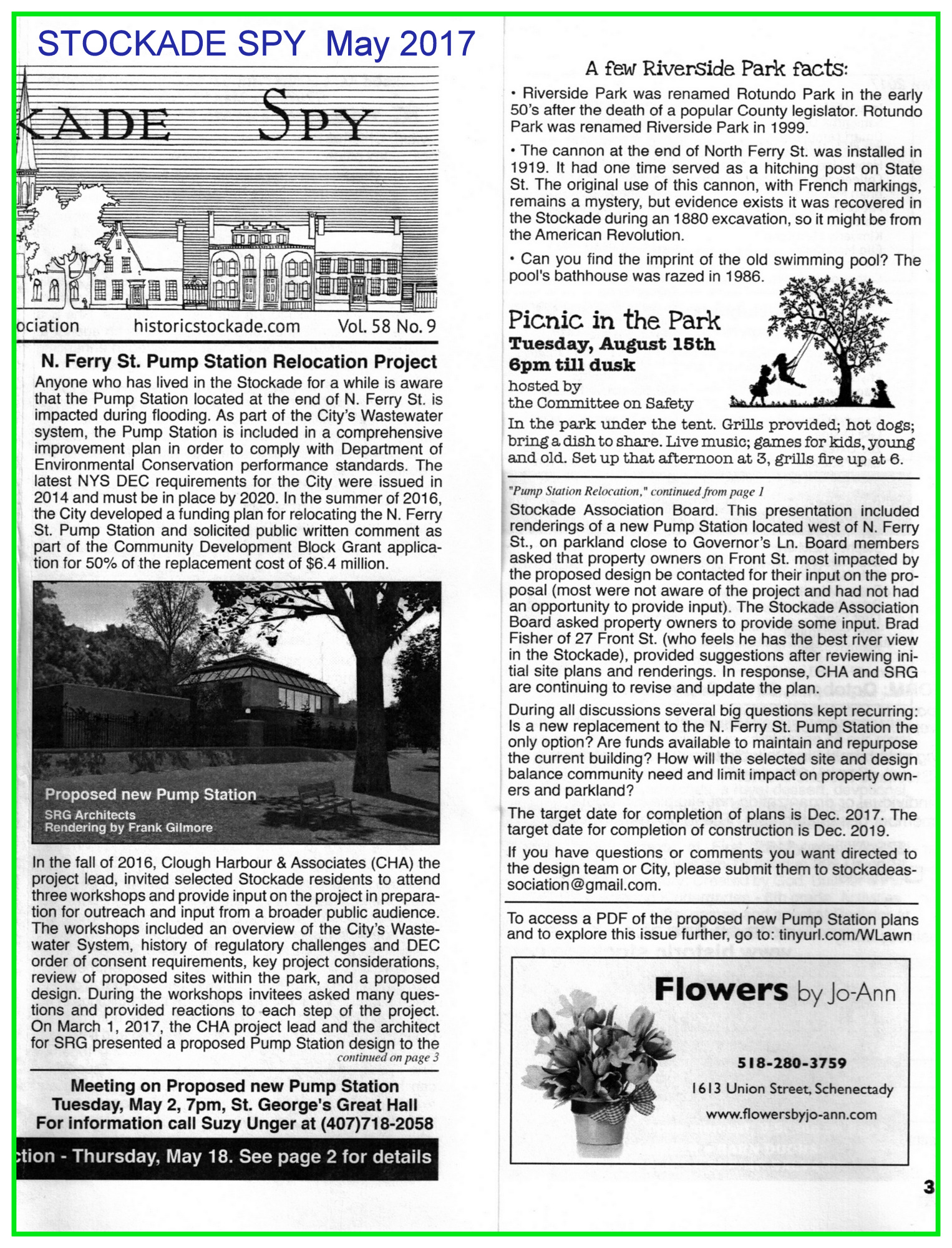 Click this link to see the 25-page Presentation to the Stockade Association Board of the proposed North Ferry Pump Station Project, given on March 1, 2017, by architect Frank Gilmore and CHA’s lead engineer Mike Miller. And, click this link for treatment of the Pump Station in the May 2017 Stockade Spy.