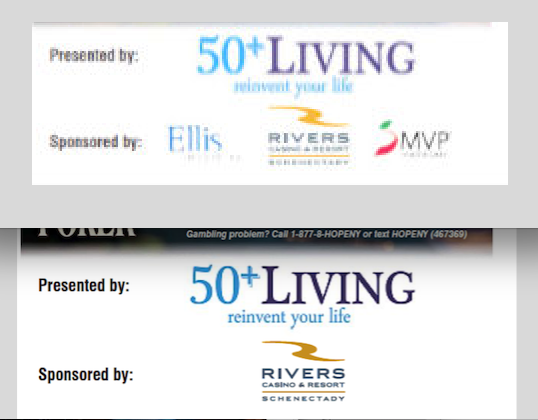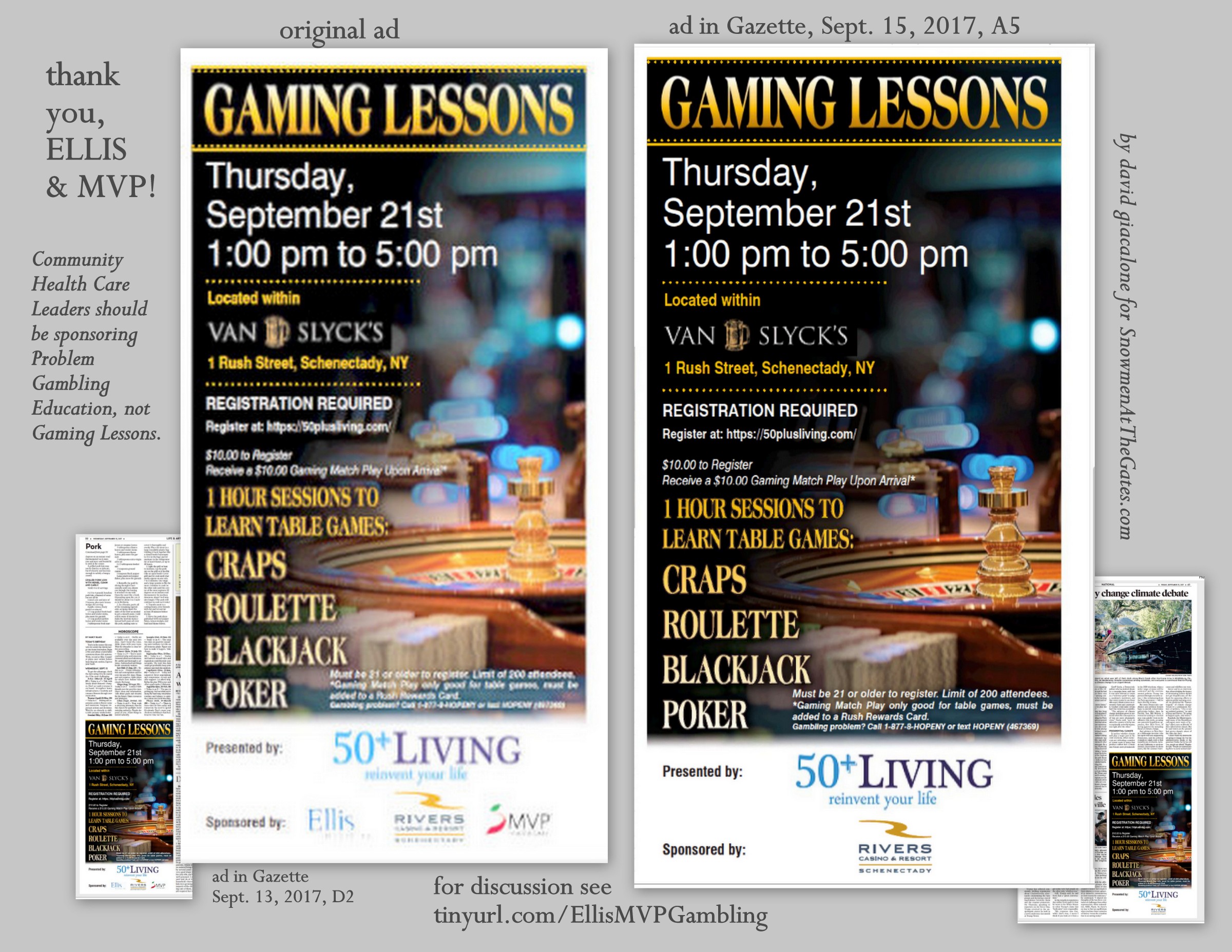 There was a pleasant surprise for me on p. A5 of today’s Daily Gazette. I glanced at the Rivers Casino Gaming Lessons ad and noticed a difference in the spot naming the sponsors: Only Rivers Casino, with Ellis and MVP removed. The first attachment [shown here at the right] shows the prior Sponsors portion of the Gaming Lessons ad and today’s version. The second attachment is a collage depicting the story in more detail, including reference to my posting on Wednesday, at SnowmenAtTheGates.com, “Why are Ellis Medicine and MVP promoting Casino Gambling?”, at http://tinyurl.com/EllisMVPGambling