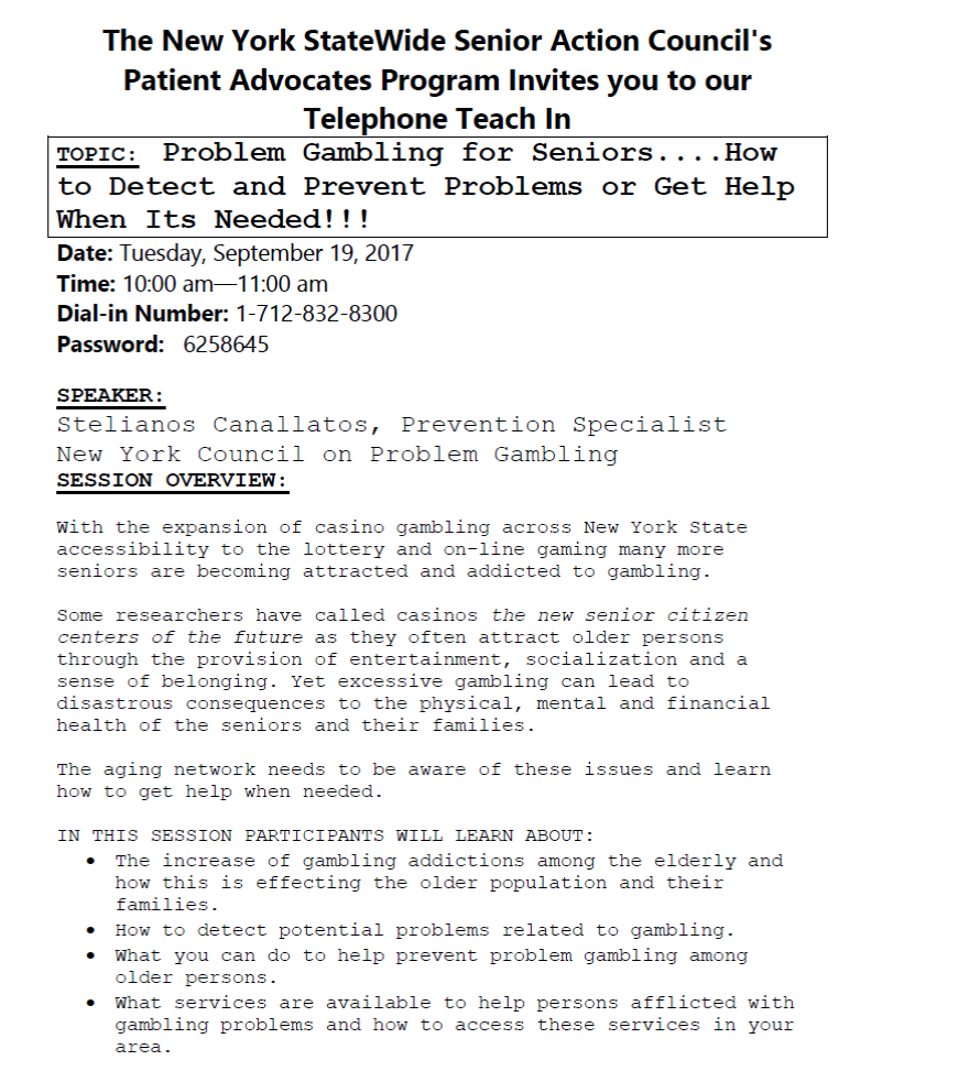 p.s. Please note, on Tuesday, Sept. 19, 2017, from 10 AM – 11 AM, there will be a Problem Gambling for Seniors phone conference “Teach-in”. The third attachment has the information. Thanks, Rev. Phil Grigsby, for forwarding to me an email sent on Sept. 13 by David Smingler of the Ellis Medicine Government Affairs Office to a broad group of interested persons.