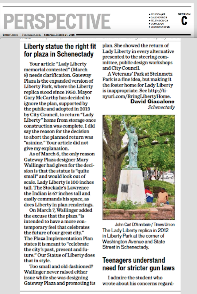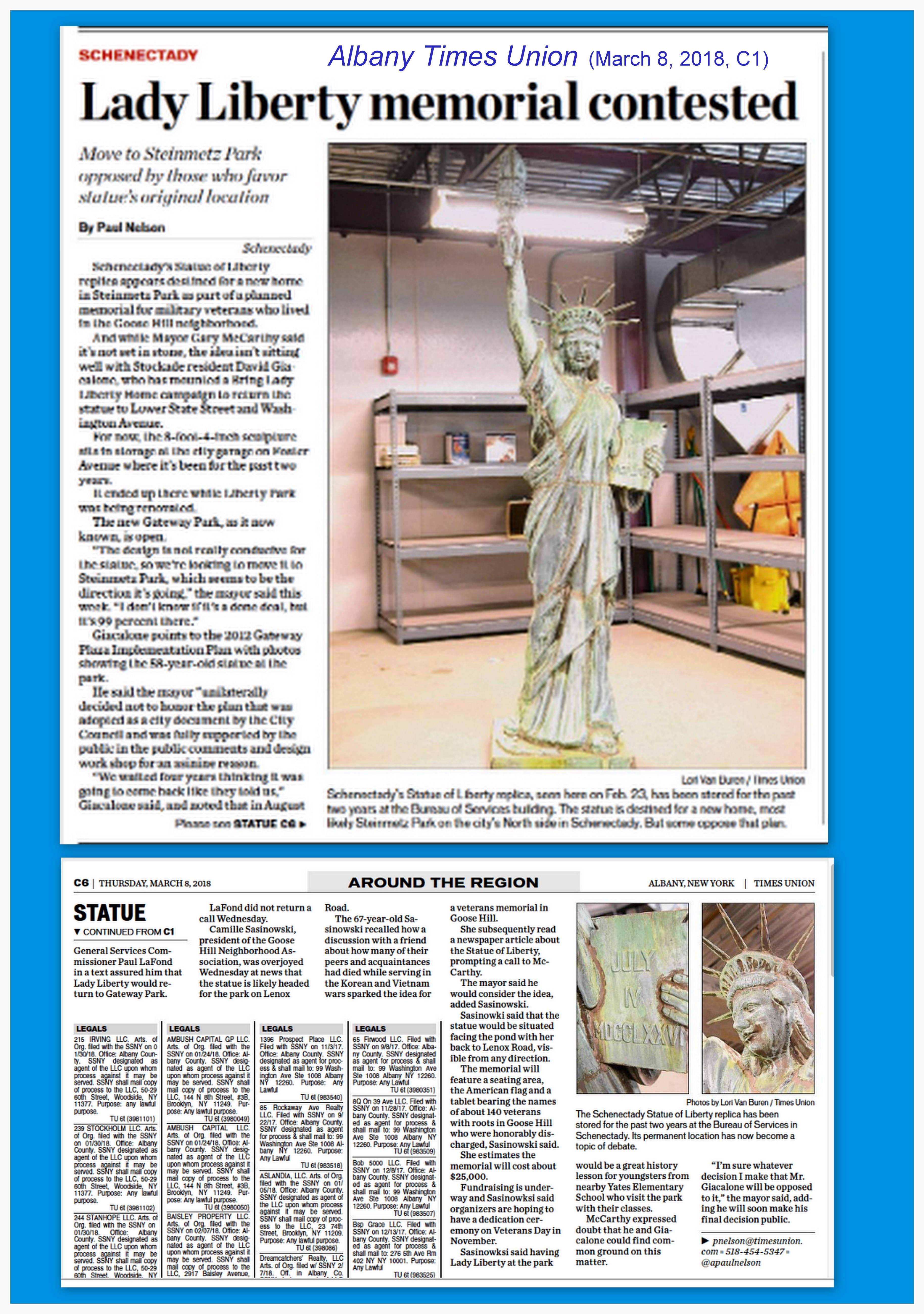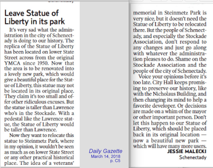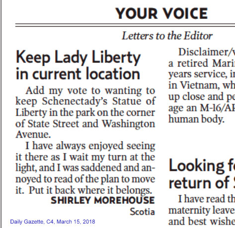 update (March 6, 2018) See “Dispute brewing over city park site for Schenectady’s Statue of Liberty” (Albany Times Union, by Paul Nelson, posted online March 6, 2018; newsprint screenshot at left). The article starts: