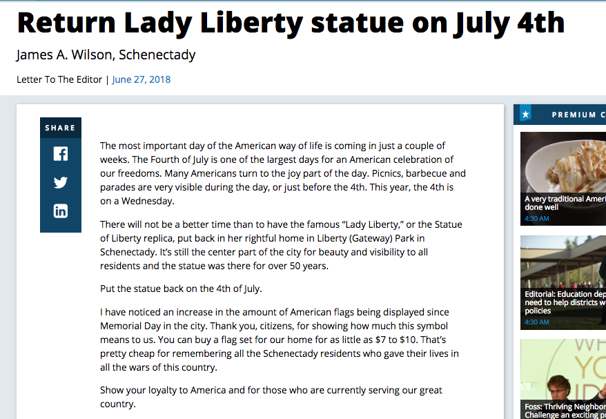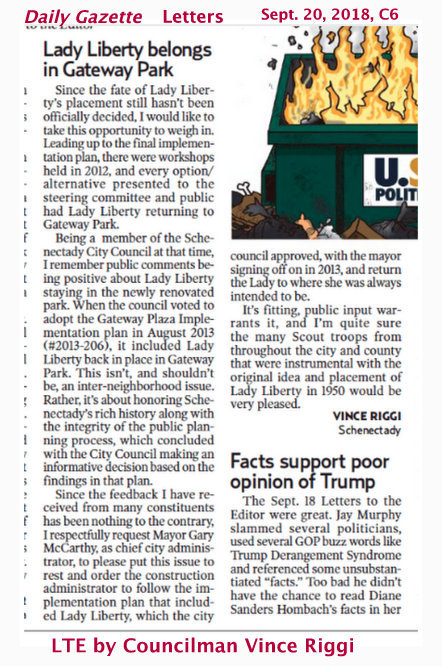 The Daily Gazette Editorial Board’s editorial “Don’t Move Lady Liberty“ (April 5, 2018), saying “City officials deciding the fate of the city’s 8-foot-tall replica of the Statue of Liberty should end the tug of war over the statue and return it to where it was always intended to be, in its place of honor at the gateway to the city of Schenectady in Liberty Park.” (Click on thumbnail to the left to see the entire editorial from Friday’s Gazette.)