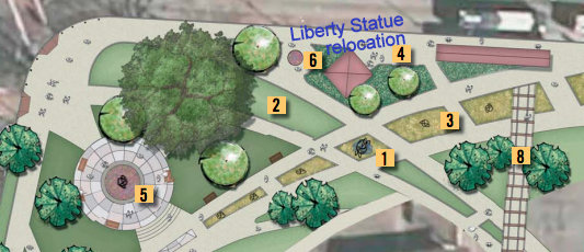 The statue would not be there as sculpture, but as a part of the City’s history (and future). - Lady Liberty is the same size as when Mary oversaw plans to bring her back to the Park/Plaza. And, the Lady’s scale looks fine in the rendering showing her at the planned relocation spot. [image at right] Some might say the original location, with the giant maple and other trees and vegetation, plus surrounding berms, in some ways made Lady Liberty look smaller.