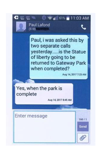 Only six months ago, on August 14, 2017, City Councilman Vince Riggi responded to constituent inquiries about whether Lady Liberty would be coming back to her old home, by sending a text message to Paul LaFond, the City’s Commissioner of General Services. Mr. Riggi asked, “is the Statue of Liberty going to be returned to Gateway Park after construction.” Commissioner LaFond replied less than an 90 minutes later: “Yes when the park is complete.” [see screenshot to the right]