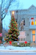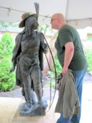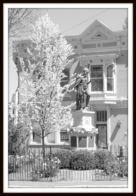 As a statue, the Liberty replica is certainly not too small to have an adequate and appropriate impact. As I have written back to Mary Wallinger, the Liberty replica is 100 inches tall, 8′ 4″. The Stockade’s famous and beloved statue of Lawrence the Indian is 67 inches tall, a mere 5′ 7″. That is almost three feet (and 33%) shorter than Lady Liberty. At that smaller size, Lawrence nonetheless commands his space in an open traffic circle (in color or b&w):