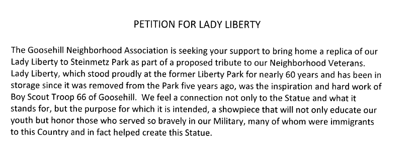 To support their argument that Lady Liberty should be brought “home” to Steinmetz Park, for inclusion in a Veterans Memorial, the proponents of the Steinmetz Park plan circulated a Petition for Lady Liberty. The text of that Petition is above (click on it for a larger version). It was presented by “rebuked” former councilman Dave Bouck, to City Council at the March 26 Council Meeting. Some important points need to be made about the Petition: