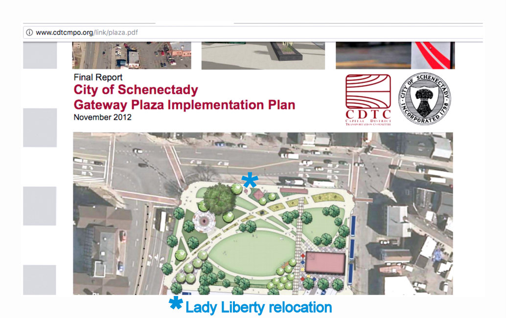 b) That “plans change.” Of course they do: initial brainstorming and concepts lead to refined and limited concepts and drafts. But, once a formal design process, with formal public participation (including a Steering Committee of “stakeholder” institutions), is adopted by the City Council and signed by the Mayor, only true safety, engineering, and financial problems traditionally are the basis of any significant change, especially without public participation in making the change. Here, there was one change: The Designer changed her public position, and wants Lady Liberty banned from Gateway/Liberty Plaza. As a result, because she is a Favorite of, and (as Planning Commission Chair) a Favor-Performer for, the Mayor, her design wish is being foisted on the City, along with her grand vision of what makes Schenectady seem “contemporary”. And,