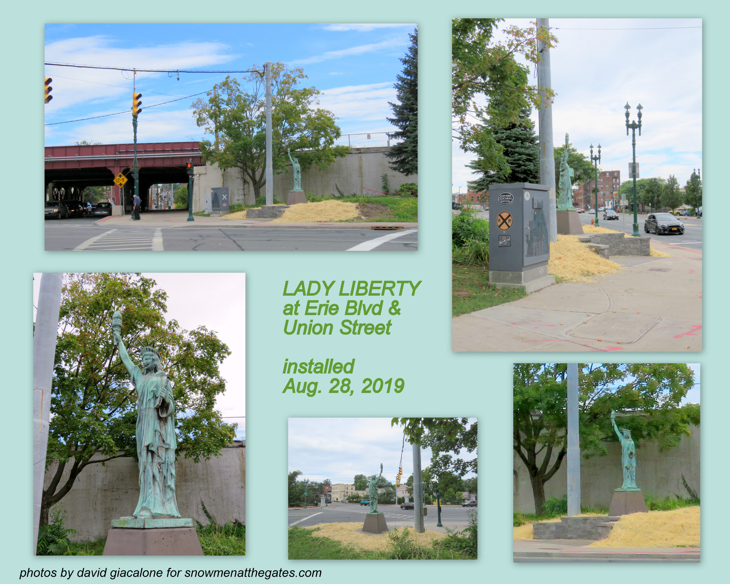 . . Sadly Inevitable Follow-up (August 28, 2019): We had hoped that Mayor Gary McCarthy would be wise enough to swallow his pride and do the right thing with Lady Liberty. Sadly, no. Nor was Mary Wallinger, who somehow convinced him to exile the Lady from Her Park. Today, the replica statue was installed at the SE corner of Erie Boulevard and Union Street, one of the zaniest intersections in the City, and a most unlikely place for the Lady to expect visitors. I’ll have more to say soon, and will link to the new material. Check out Pete DeMola’s Gazette article this afternoon, here ; and a TU article by Paul Nelson. For now, here is a collage with photos taken of Lady Liberty her first lunchtime at Her new location: