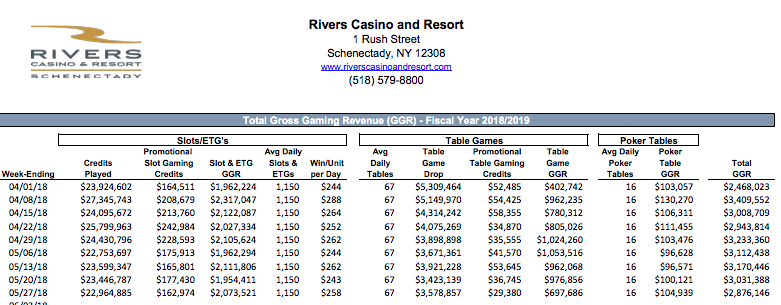 Perhaps all the Holiday Weekend trekkers had already started their return trips home, or were squeezing in one last cook-out at a relative’s or friend’s backyard. It made me wonder, though, how much gaming action had been going on at Rivers Casino over the weekend. The weather on Saturday and Sunday had enough rain in the forecast to motivate indoors activity such as that found inside the Casino. So, I checked out the weekly Revenues report for Rivers Casino that went online yesterday, Friday June 1st. However, as you can see by clicking on the image to the left of this paragraph, last week Rivers Casino at Mohawk Harbor had its worst week for gaming revenues since the end of March, with a total GGR of $2,876,146 for the week ending Sunday May 27, 2018.
