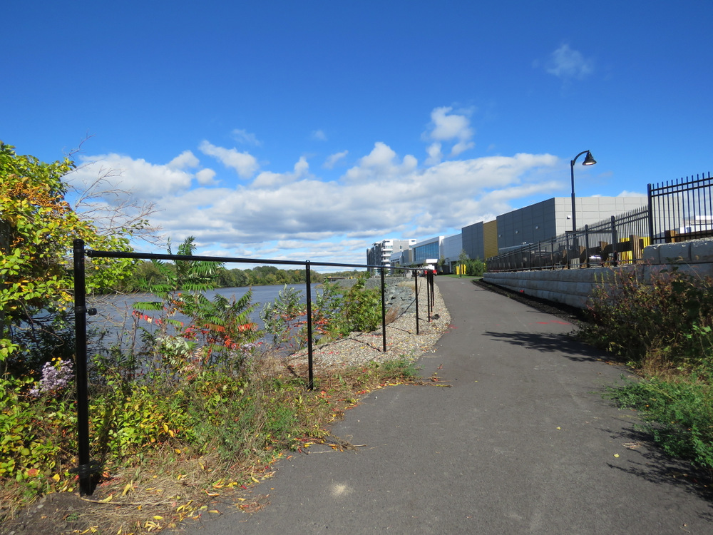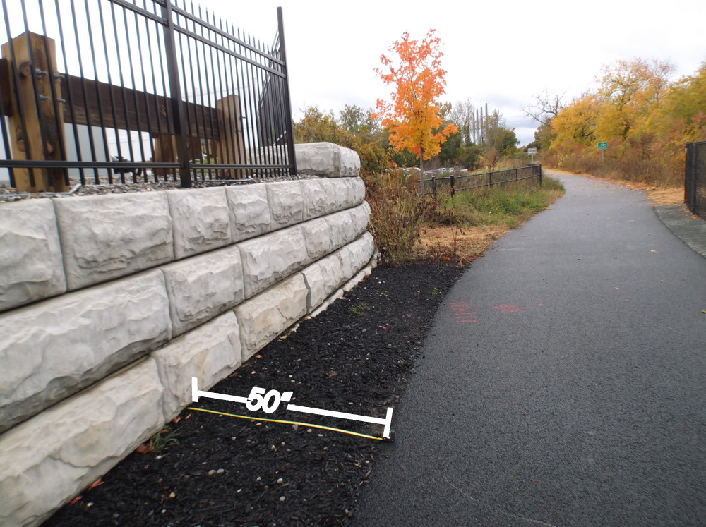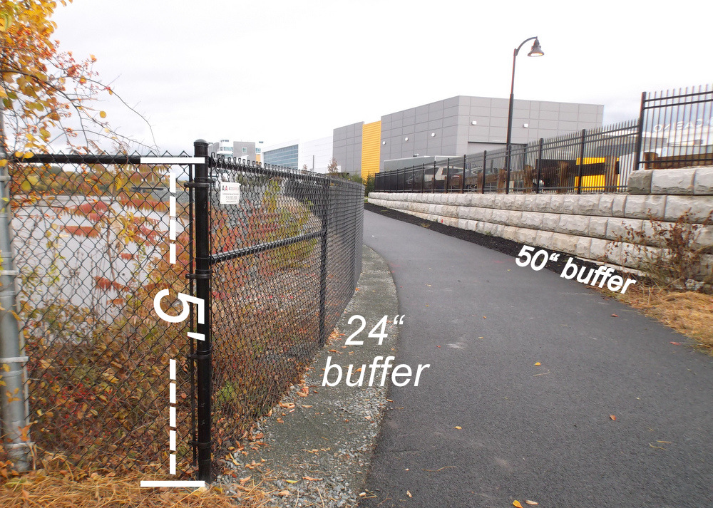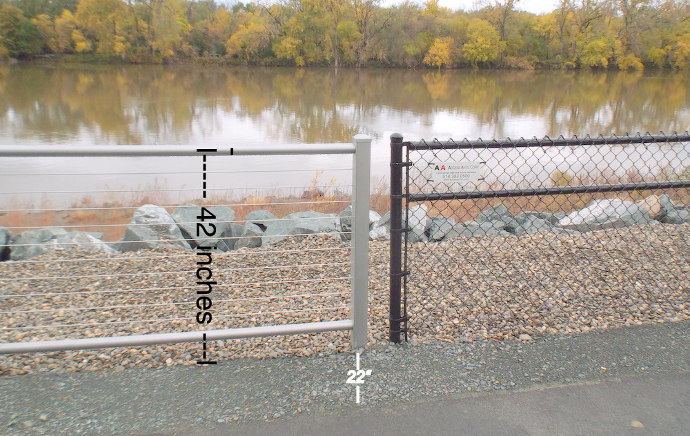 . . at the west end of the Mohawk Harbor trail, the new fence along the riverbank has only a 24″ buffer from the edge of the path; while the wall on the other side of the path has a much safer 50″ inch buffer.