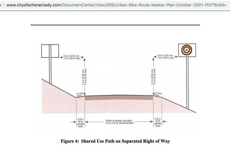 I hope no one in authority will try to argue that a fence 3/4 of a mile long is not a furnishing and not as troublesome as a sign post in presenting a hazard to trail users. A screen shot of the BikeSchenectady page is inserted to the right (click on it for a larger image]; also, click here to see a relevant page from Schenectady’s 2001 Master Bike Plan (mandating a three-foot clearance to obstacles); and a useful page from the Cayuga-Seneca Canal Trail Master Plan. , which explains (at 29, emphases added):