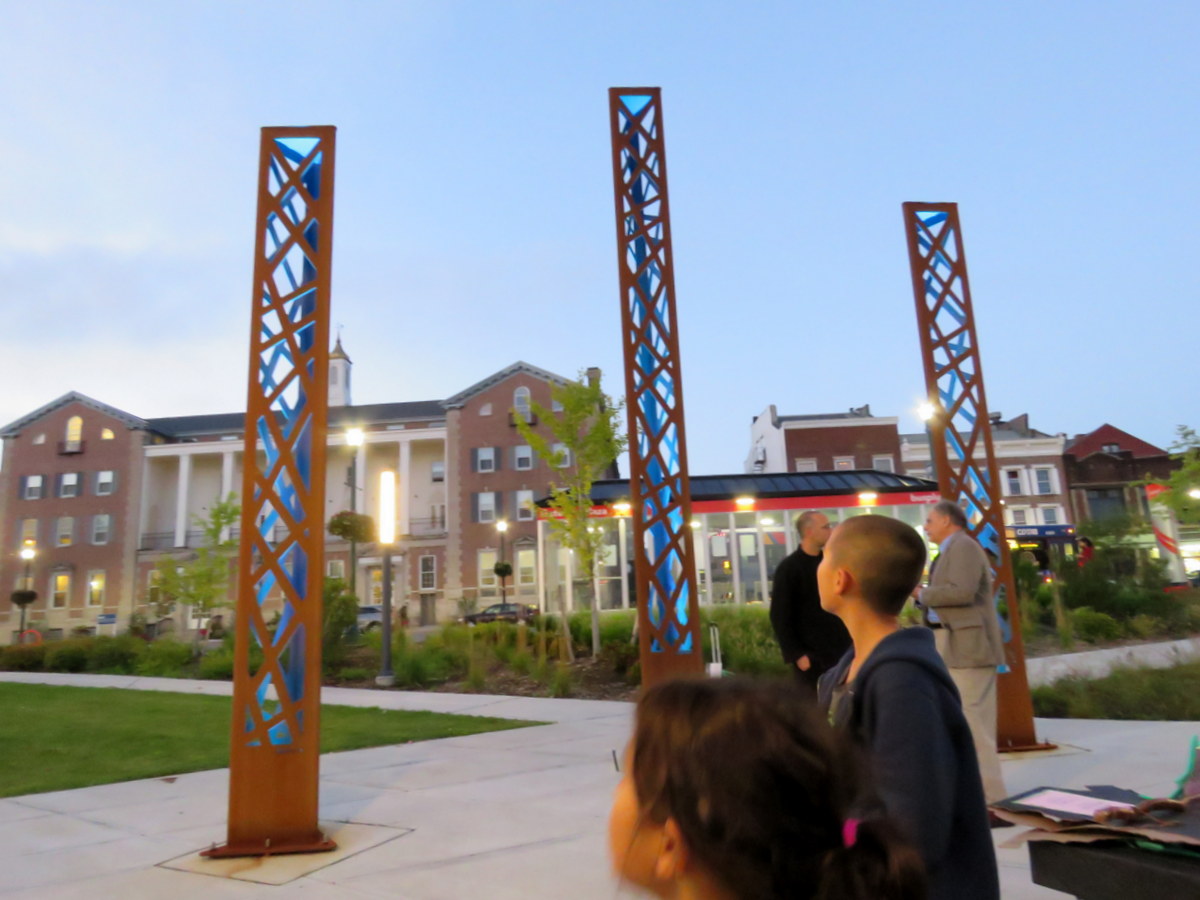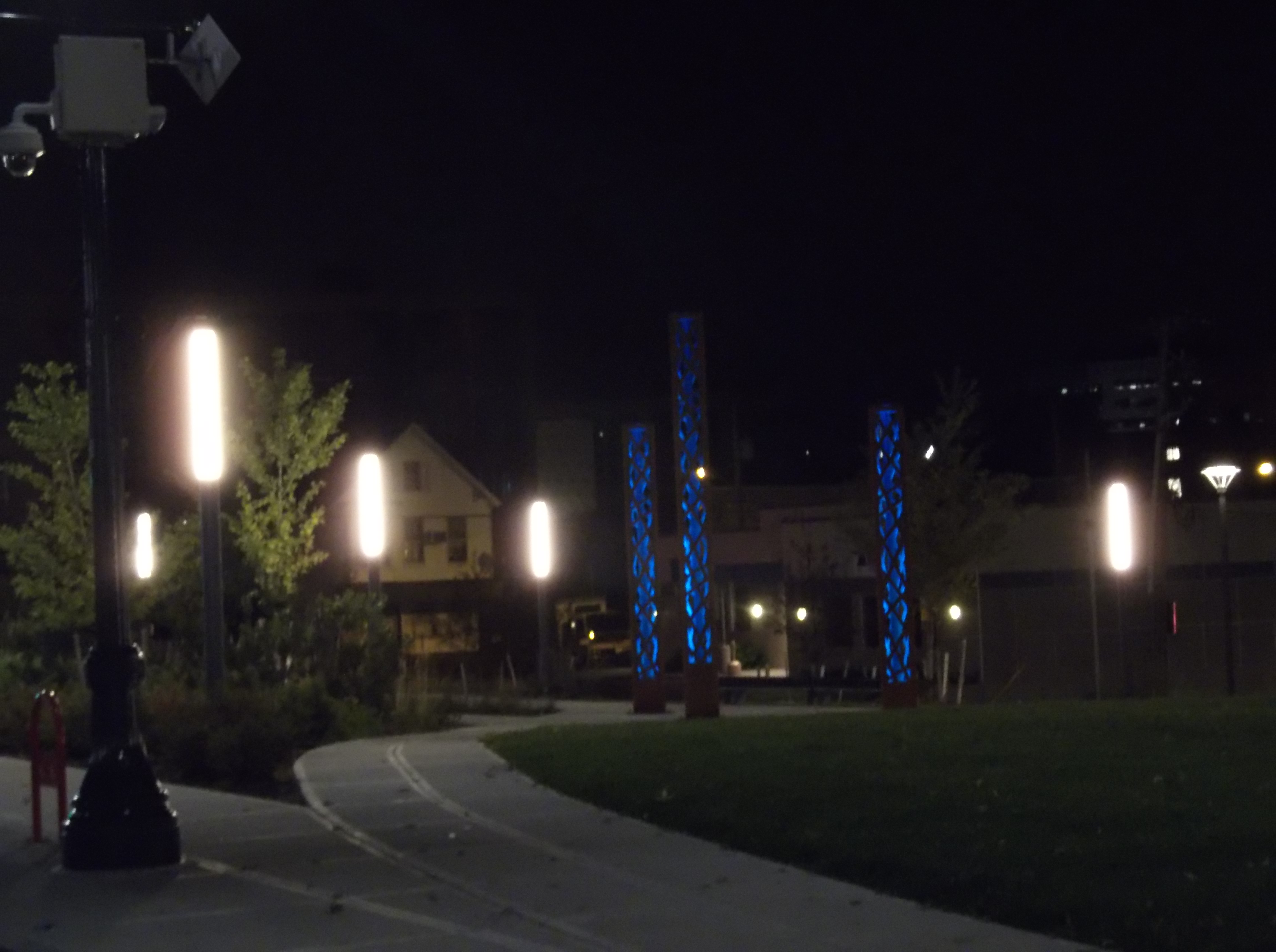 Of course, the Plaza fixtures aren’t officially called “Rusty Girders” & “Light Sabers”. They are the modern sculpture and lighting fixtures that have been permanently installed along Gateway Plaza’s [Liberty Park’s] Water Street Pedestrian Way. What do you think?