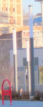 Public Reaction? The best review of the Lamp Pillars that I have heard is that they look really cool at night. Of course, ignoring their bland appearance all day so that relatively few people might see the lamp portion at night is not a great trade-off.- Similarly, as to the girders, [1] Some passers-by think the off-the-shelf pillars must be remains from the 9/11 Tragedy at the World Trade Center or perhaps are an allusion to the City’s once-great industrial past. I do not know whether Ms. Wallinger was trying to make such references, despite her professed goal this year of honoring Schenectady’s future. [2] Close up, I find the blue light glowing in the Open-Pillar Lighting Columns fun to view and photograph. But, how many people will have that experience after sunset, especially when the glow is scarcely noticeable from State Street even in full darkness (perhaps because the light pillars are so bright)?