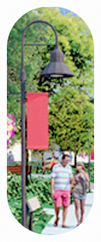 [L] rendering detail showing decorative lamp poles along the Pedestrian Way (with a Venus de Milo replica and a modern red sculpture further down the path) . .