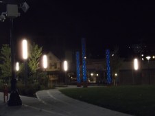 The light poles are “Unilamp’s Contemporary Light Column / PMMA / LED / For Public Spaces: Pillar“. The sales copy for the light column states: “It is intentionally used for highlighting the surrounding structure works in modern architectural areas. Because of its eye-catching look, it is suitably applied in square, commercial areas and open spaces.”