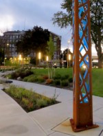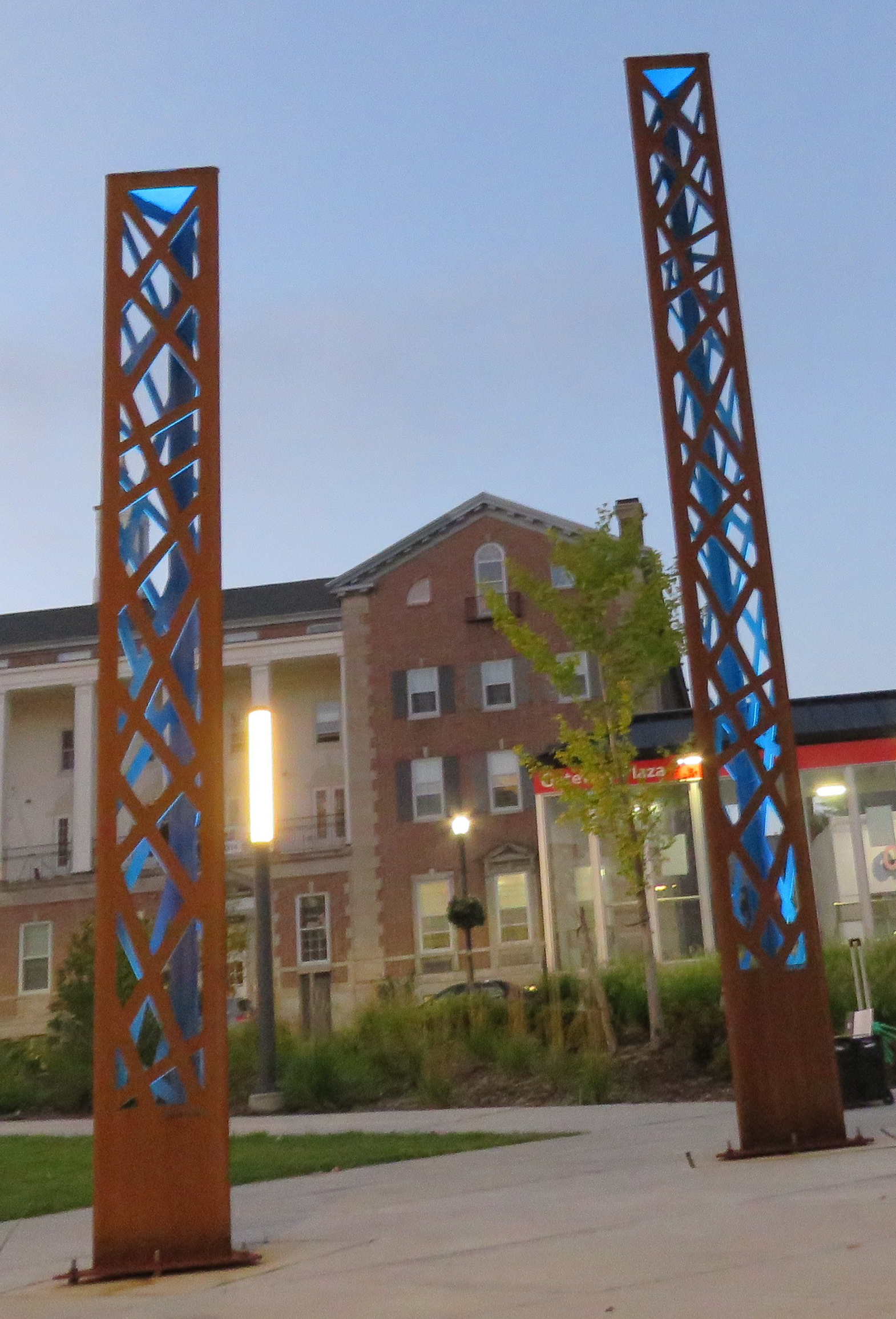 The girders, which have been placed at the Central Focal Point of the Plaza as urban sculpture, are “Open Pillar Corten Steel Lighting Columns“, described as “triangular LED-ready lighting columns with a lattice-like graphic pattern.” Their attributes: They “break the horizon with a strong vertical expression. The abstract geometrical pattern can blend into almost any atmosphere. The distinctive open pattern allows vegetation to climb and grow, introducing vertical green in open spaces.” Ours have no vegetation, but do have blue LED lighting that can be seen starting around sunset and dusk.