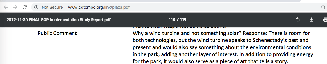 When asked at the Implementation Plan’s Design Public Workshop, “Why a wind turbine and not something solar?” [image at left shows text in the Report], the design team representative, Ms. Wallinger, gave the following response: