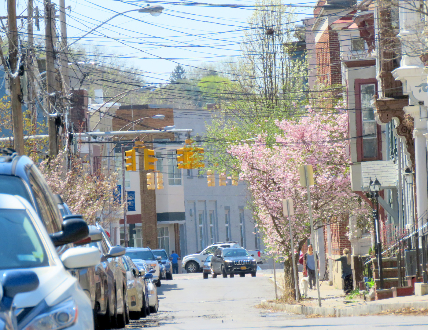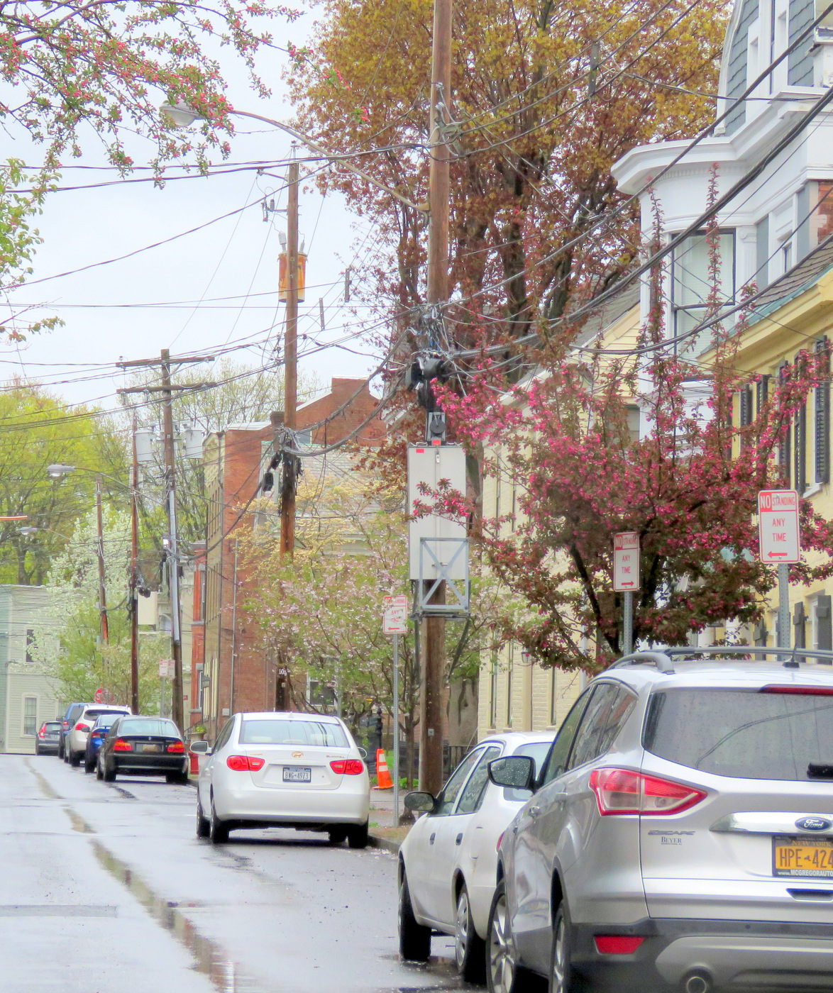 When preparing photos of the recent crop of Stockade cherry blossoms for sharing online and with email, I found myself close-cropping virtually every image to minimize seeing the mess of wires. For example, here is the actual and the cropped version of a cherry blossom scene just north of Union Street on N. Ferry: