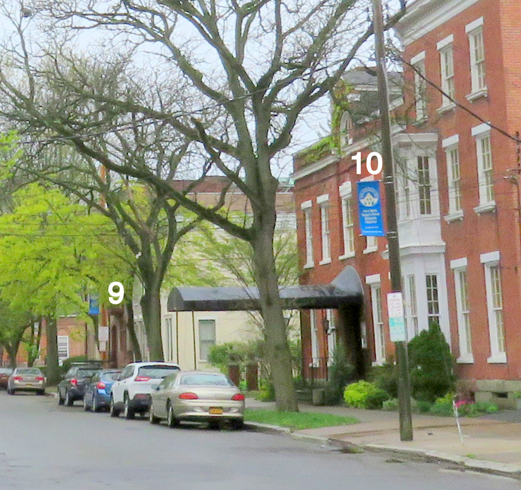 see a dozen of the blue Stockade District banners (when the leaves are down). Here are images of those banners taken May 2, 2019, with the banners numbered; click on a photo for a larger version: