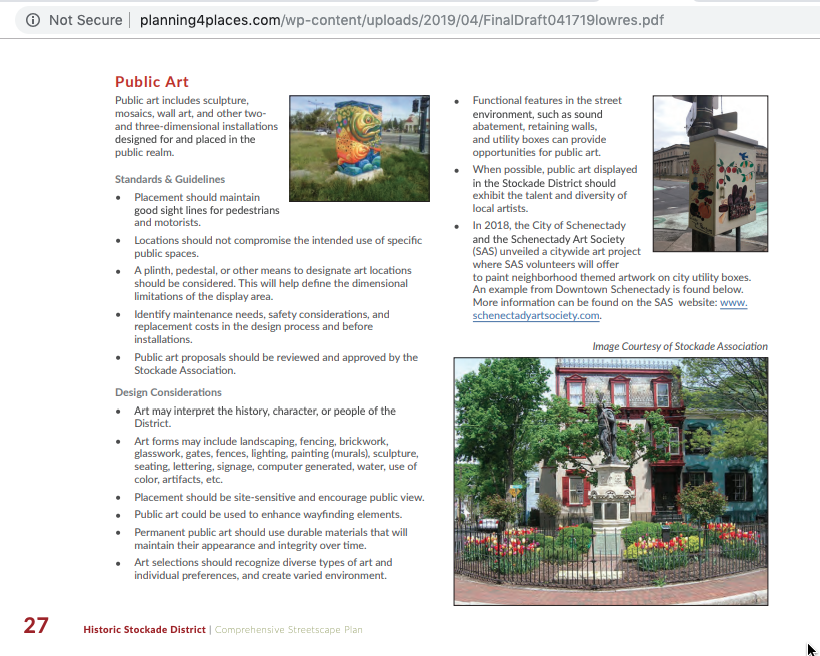 PlanFinal-StreetArtFollow-up (Dec. 23, 2019): Although the Final Streetscape Plan continues to propose the use of Street Art in the Stockade (at 27; see screen shot of the page to the Left), the recommendation that utility boxes be painted has been removed. See Final Appendices, Appendix F, last Comment and Reply, p. 88). The removal of one of the most worrisome recommendations in the Draft Plan is much appreciated.