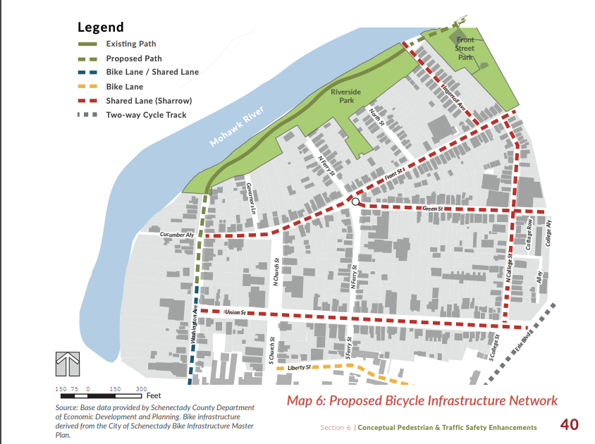 • Stating that the designation in Bike Schenectady of the portion of Washington Avenue from the River to the Historic Society as a future bike path (as opposed to a shared auto-bike roadway) appears incorrect and not practical. [Motorized vehicles such as cars and SUVs, and trucks, may not travel on a bike path.]