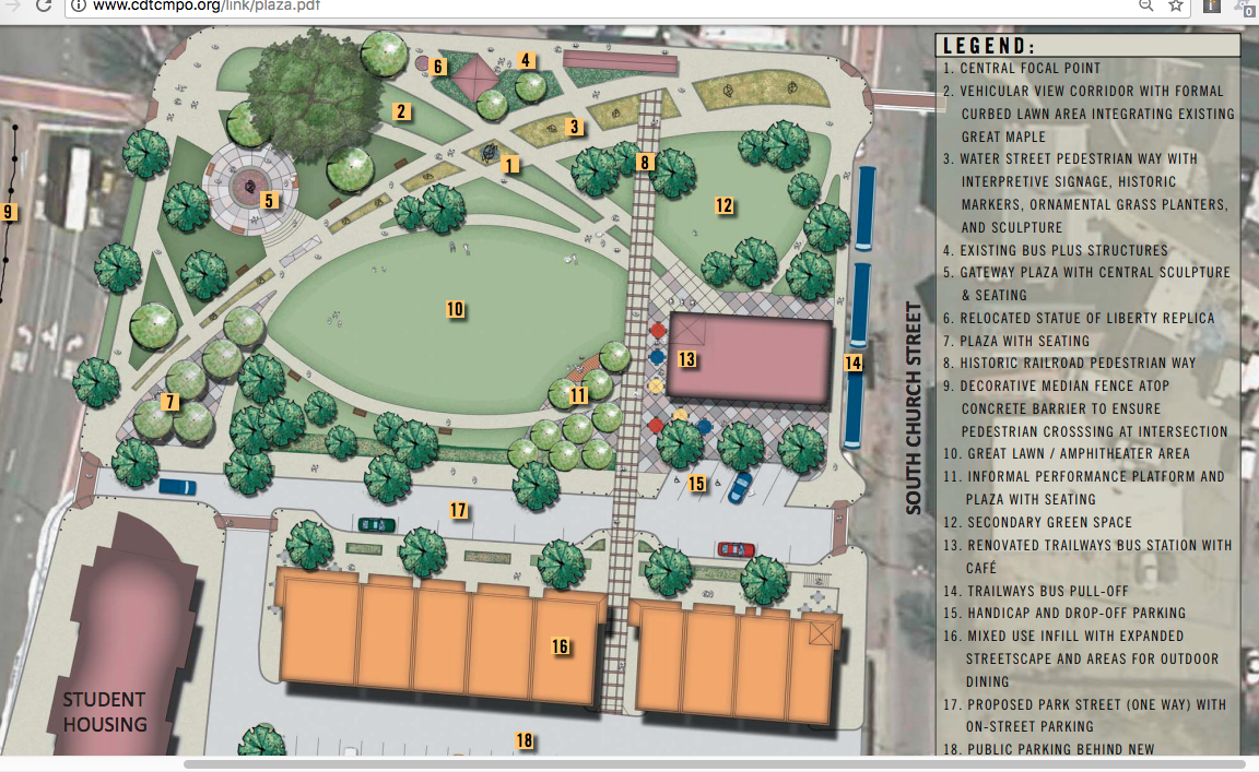 The STATUE IS TOO SMALL, so that the Statue would be overwhelmed in the big Plaza. This was the reason that Mary told me in an email, when I first asked why Lady Liberty was not returning to Her Park. [Response: She’s not too small in the scale rendering done for the Implementation Plan (see detail at right from this rendering). In addition, Lawrence the Indian is almost three feet shorter and commands his Circle, as is Thomas Edison down at Erie Blvd. and S. Ferry. An experienced landscaper should be able to create a niche for the Lady somewhere at this large Plaza, honoring Her, without creating a space that is too-enclosed for safety.]- “PLANS CHANGE“: In defending her wish to keep Lady Liberty out of the new Plaza and to send Her to Steinmetz Park instead, Mary told the City Council Meeting of March 26, 2018 that “Plans change,” giving the example that the design team had originally planned to have a road going through the Park. As discussed above, this justification for failing to return Lady Liberty ignores the distinction between the many stages of an open-minded planning process and the decision to change, without public input or return to City Council, a major aspect of a Final Plan that has been through public workshops and approval by the City Council. Neither Mary Wallinger nor the Mayor claimed any safety or engineering issues for not returning Lady Liberty. (The presentations “from the floor” to the March 26, 2018 City Council Meeting are discussed more fully in the posting “Lady Liberty is Timeless“.)