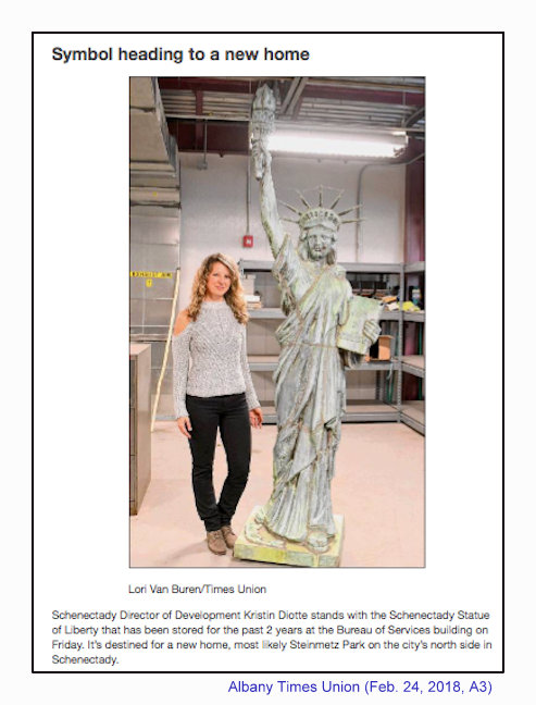 Our neighboring upstate City, Utica, New York, also received a replica of Lady Liberty in 1950, thanks to their local Boy Scouts. It is apparently two feet shorter than Schenectady’s and had deteriorated badly. Nonetheless, thoughtful people of Utica decided to pay for a complete restoration of their Liberty Replica (with donations to cover the $10,000 expense), to reestablish its grand presence on their Monument Parkway. See the May 17, 2017 Newsletter of the Central New York Conservancy.
