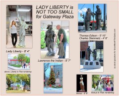 The STATUE is VERY DAMAGED, VERY EXPENSIVE to REPAIR. Response: This damage and expense were not mentioned until months after the decision to send the Lady elsewhere was made (she looked pretty good next to Director of Planning Diotte, in photo to left). Also, there has been no description of the damage, or apparent action to get an estimate, much less get it repaired and back in public view. Some of the expense should have been part of the original Plaza budget (which did show a $20,000 expense for relocating the Lady Libery within the Plaza, since the statue and base would have been slated for at least refurbishing, if Ms. Wallinger ever planned to return the Lady to Liberty Park. Also, the money saved by not buying a new sculpture for the Main Sculpture location should go toward any needed repair, followed by placing Lady Liberty at the main sculpture spot, approximating her original location.