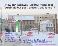 to fit in with the intended style of the new Plaza, which she insists is meant to “celebrate the future” of Schenectady. [Response: (1) That formulation truncates the original goal written by Wallinger in the Implementation Plan: the Plaza will “celebrate the past, present, and future” of Schenectady. And, (2) One is hard-pressed to find a “style” of design at the Plaza, and the well-known and beloved appearance of Lady Liberty might take the edge off the mood set by rusty girders and light-sabers. In general, urban design that tries to seem contemporary often seems merely “temporary” and quickly dated.]