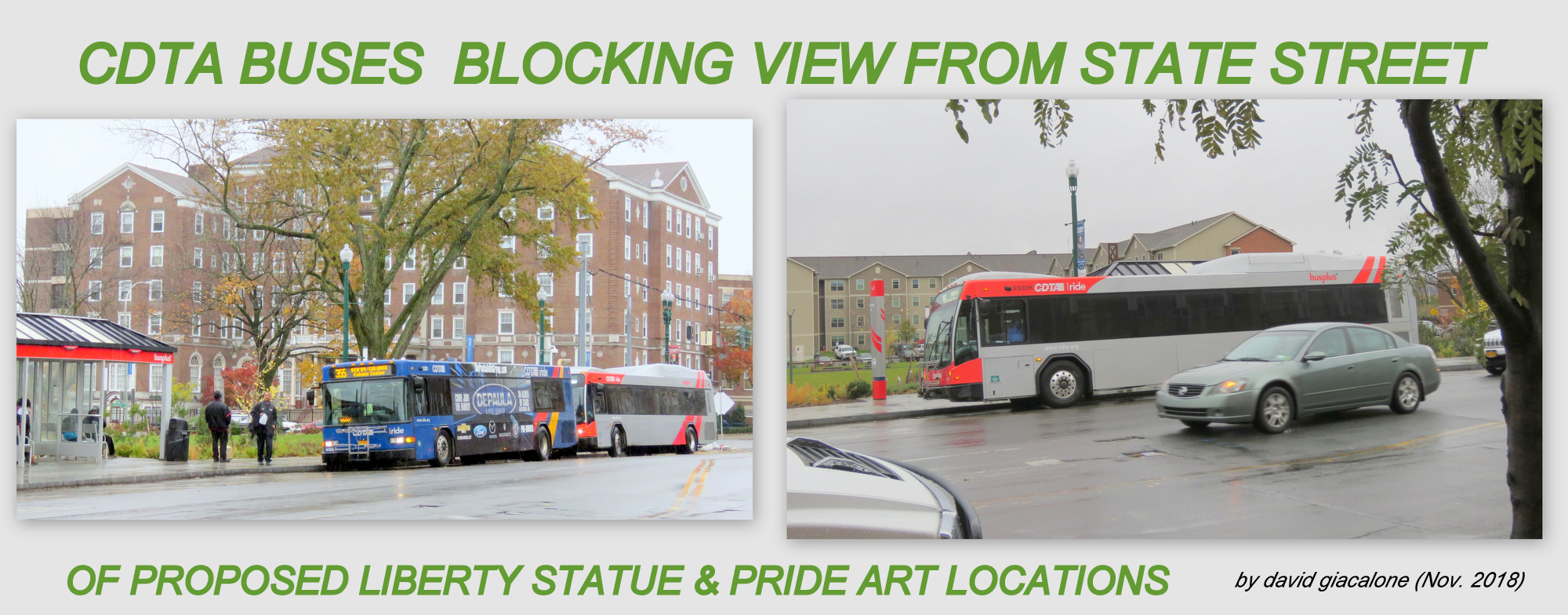 “SHE’D LOOK LIKE SHE’s CATCHING a BUS”. [Response: This flippant remark to a reporter is from the designer/planner who chose the relocation spot for Lady Liberty next to the bus stop, and (see image to right) insisted the Statue would seem grander there and have more exposure. At this website, we worried that CDTA buses would line up blocking out the view of Lady Liberty from State Street much of the day — another reason to return Her to her original location in the Park, now called the Central Sculpture Area].