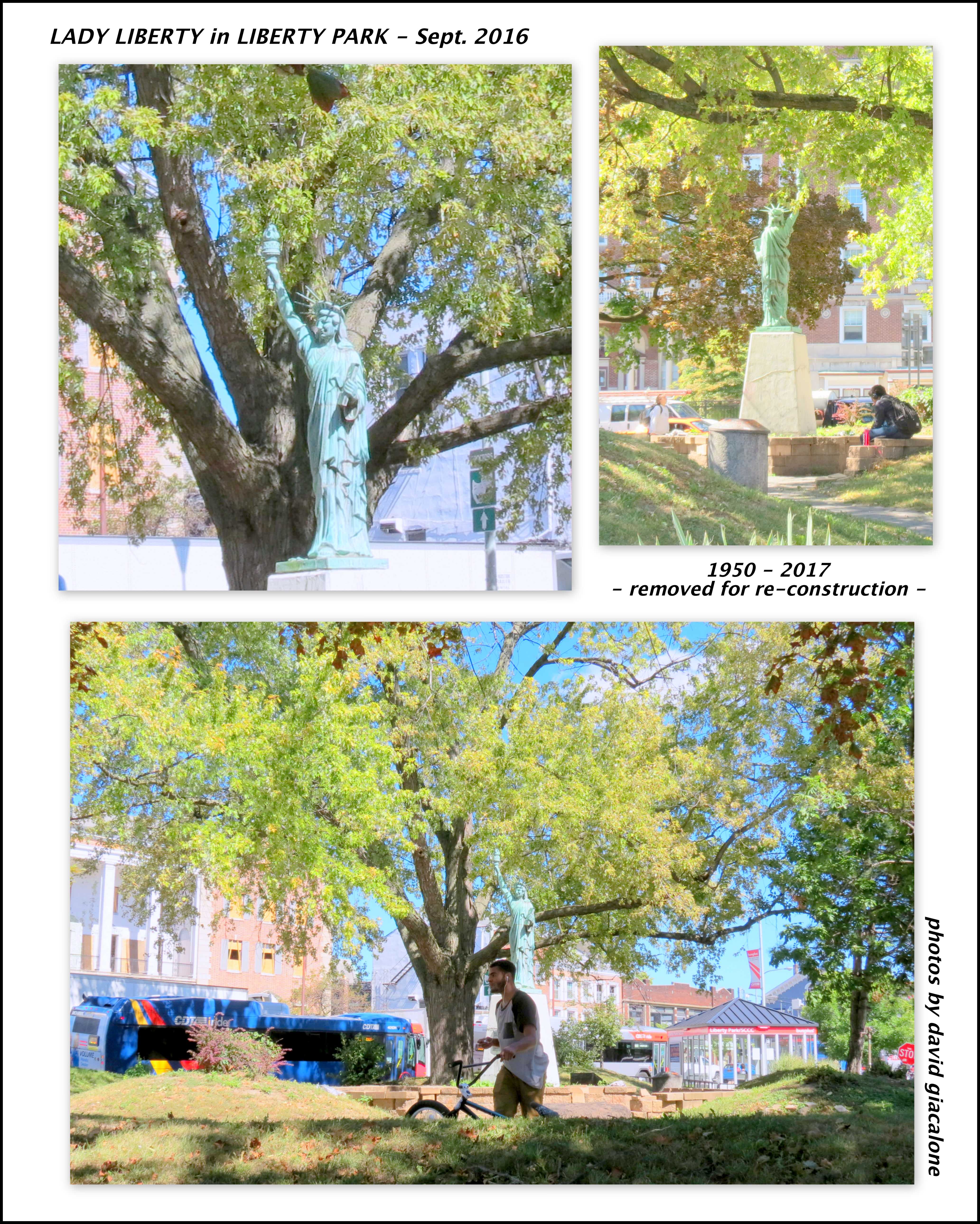 The Beer-Drinker Anecdote. Mary, early in her Tour presentation, told her audience just how dreadfully designed, over-vegetated and unsafe Liberty Park had been prior to its reconstruction [click on image to the right for photos taken September 2016, before the reconstruction started]. It seems that in 2015, Mary was at the old Park, taking photographs, when an apparently inebriated beer-drinker rose up from the vegetation to ask what she was doing. She told him she was the designer of the new Plaza, and he said he liked the privacy of all the bushes and trees. The beer-drinker then asked if he could make some recommendations. Mary’s reply was: No, we already have an approved Plan, so we can’t make changes. [paraphrased] Ms. Wallinger did not seem to see the irony of that statement, at least from the perspective of those protesting her significant changes to the approved Plan. ……………………………………………………….- The REPLICA EXCUSE: When the Tour group was approaching the upper plaza, someone must have asked Ms. Wallinger about the protestors or the missing Lady Liberty, or she simply felt the need to comment. I heard Mary speak dismissively of the significance of any dissent to her change in the Plan. Then, to justify the absence of the Statue, Mary added what was to me a new excuse for the exile of Lady Liberty. To paraphrase her explanation: