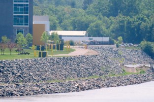 We are literally stuck with this steep, riprap bank, inaccessible to the public, with a fence later approved by the Staff that is too close to the bike-ped trail for safe, comfortable viewing of the River (and which violates the City’s own guidelines for bike paths and the specific requirements in the C-3 Zoning District for placement of the bike trail; full safety discussion here).