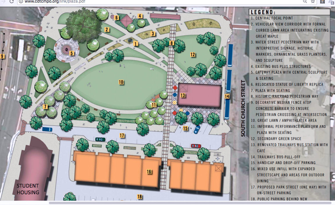 GATEWAY PLAZA SURPRISES. The Comprehensive Plan for Gateway (Liberty) Plaza is a good candidate for the Rendering Ruse Category. Ironically, the same week the “final” Pump Station Plan was set to paper, we wrote “at Gateway Plaza plans evolve.” A major element of the apparent ruse has, of course, been in the public eye the past couple of years: The failure to return Schenectady’s Lady Liberty replica to her original home in Liberty Park after completion of the Gateway Plaza construction project, as promised in the Final Plan (and every draft version). We have had many postings on that topic, this one is a good place to start to understand the story.