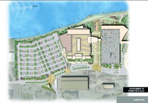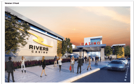 n addition to this rendering negligence on the part of the Planning Commission and its Staff, the tiny details that they were given as partial-site renderings in July 2015 ended up — whether intentional or not, you judge — covering up actual design and construction details that would have surely drawn public and hopefully Commission opposition. Thus, the truncated view of the rear (riverside) of Rivers Casino (image to the right), failed to show that the riverbank would not be a gentle slope and landscaped area allowing public enjoyment of the waterfront, as was shown in its first rendering of the Casino, given to the Gaming Commission in the Application for a license.