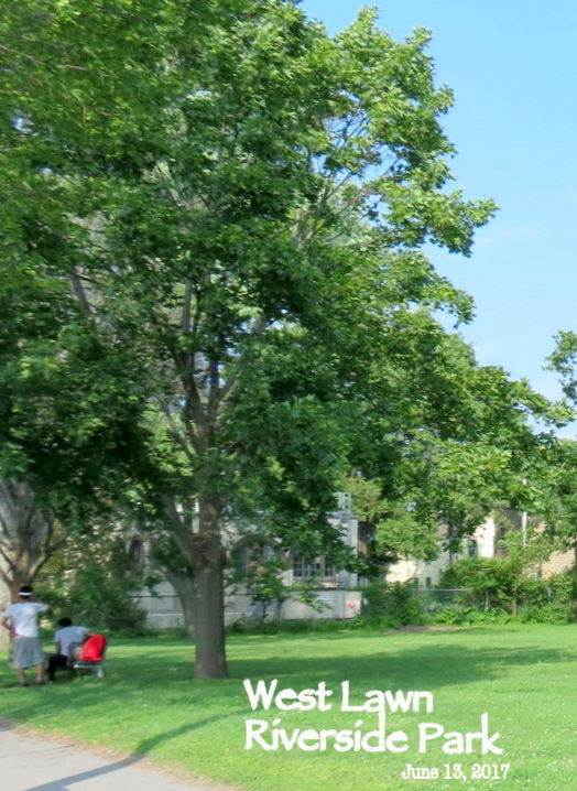 INTRODUCTION: The grand old tree that graced the West Lawn of Riverside Park for over a century was chopped down last week on Earth Day 2020, April 22. (Marked with a white asterisk in the two renderings above; 2017 photo on the right.) It was still healthy, with a diameter of 60 inches. Many Stockade residents and Riverside Park lovers where surprised, shocked, saddened. We were sure that significant tree would be preserved in the multi-million dollar pump station project being staged currently at the Park. We did know that a few “lesser” trees along the pump station’s original fence did need to come down to fit a new pump station on the lot of the old pump house. As would be expected, those lesser trees do not appear in the 2017 renderings, which are meant to show what a site will look like after the proposed construction is completed.