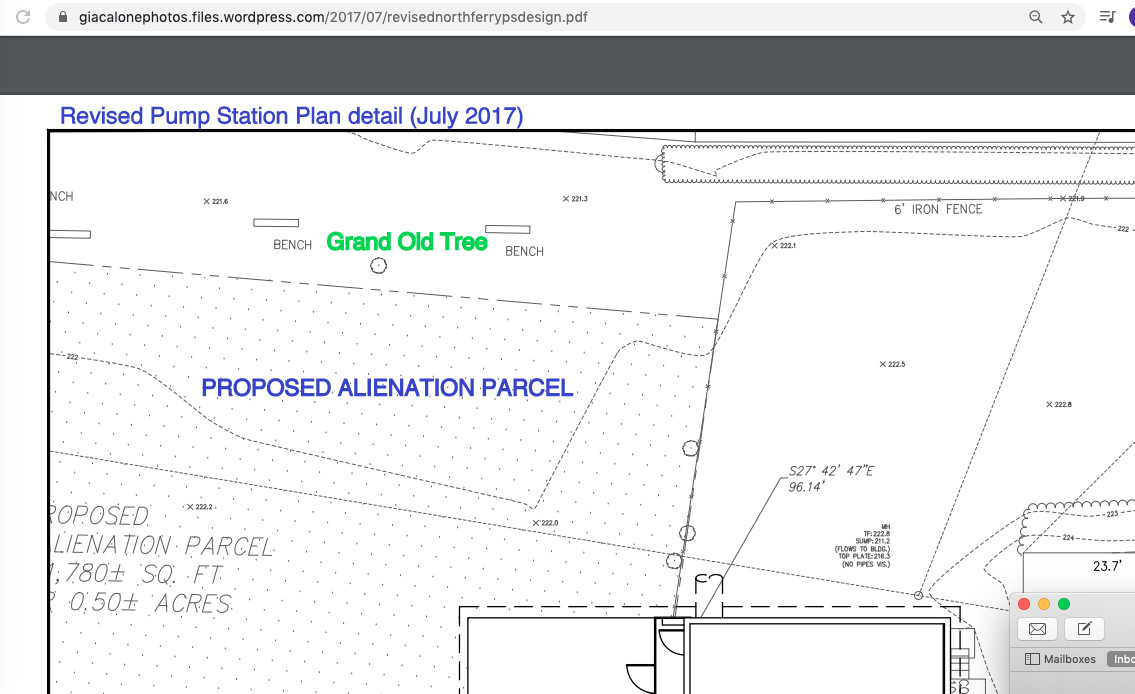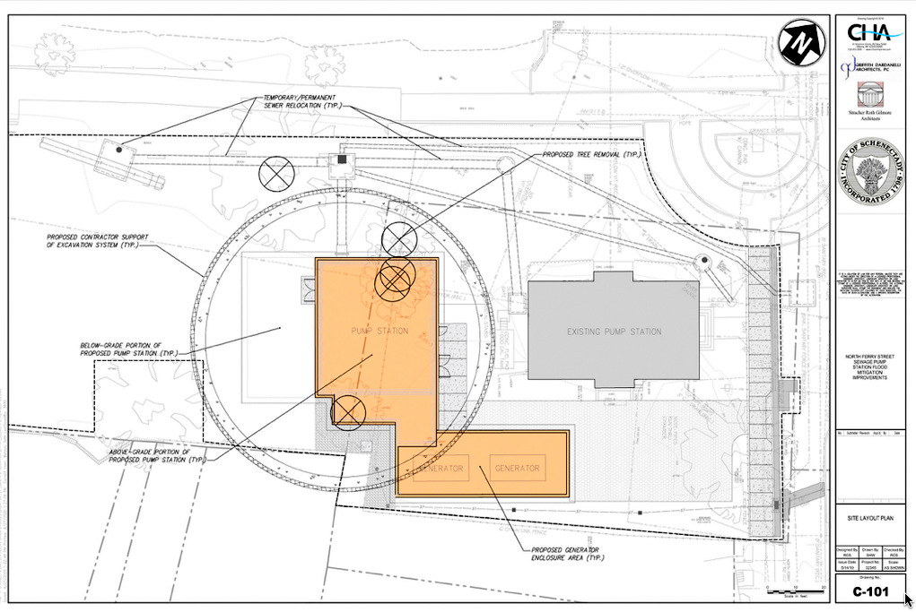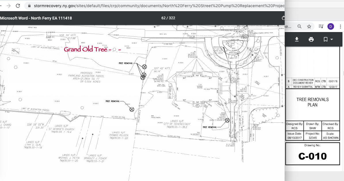 . . “surprise” May 2019 Plan . We sought explanations. In an email on April 27, 2020, to Stockade Association President Suzanne Unger, we were given “answers” by the CHA Project Engineer for the New North Ferry Street Pump Station project, Mike Miller. Mr Miller answered questions from Stockade resident Emmanuel Maillet, whose backyard borders on that part of the Park. Miller wrote that the conclusion the Grand Old Tree needed to be removed was made at the time the City asked the engineers to put the new pump station on the old lot, rather than their proposal to put it on the Park’s beautiful West Lawn. Miller added that its removal was included in the “final plans” they developed in May 2019 (click on image at head of this paragraph):