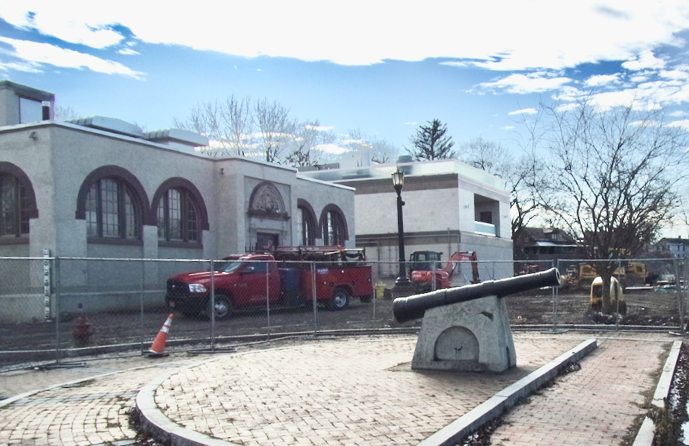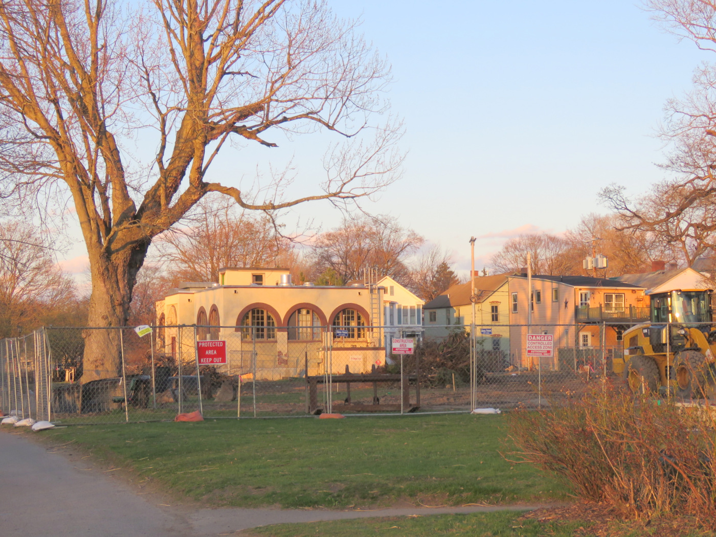 View from West, Dec. 17, 2021: New Pump Station constructed farther to the north and west than originally depicted. obstructing view of Old Pump House and taking up (“alienating”) more of the West Lawn.