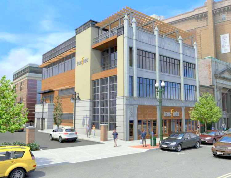 above: Transfinder Building: [L] rendering with IOOF façade preserved; [R] actual (April 2020)