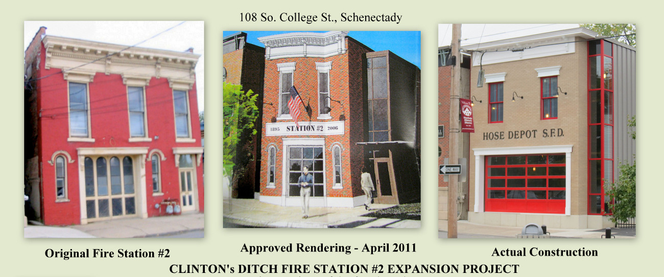 Iconic Fire Station No. 2 served the City at 108 So. College Street (between Union and Erie Blvd.) from 1895 to 2006. You can see it on the left in the collage above. When the owner of the tavern-restaurant next door, Clinton’s Ditch, wanted to buy the building from the City to expand the business, he agreed to preserve the façade of the old Fire Station. Instead, the building was demolished. Then, Mayor Stratton thought he had secured an agreement to build an exact replica. Nonetheless, the rendering submitted in April 2011, seen in the middle image above, was accepted by Planning staff and approved by the Planning Commission. The end result, now standing on the 108 So. College Street lot, to my eyes is very different from either the approved 2011 rendering or the original Fire Station.