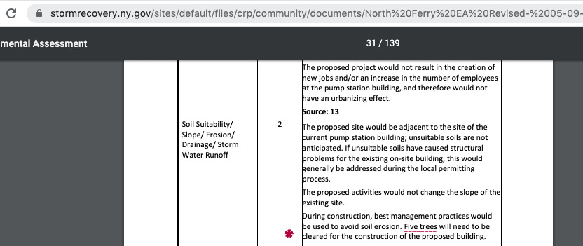 The Tree Removals Plan submitted by the City for the initial Environmental Assessment in Nov. 2018 (at 62), showed five trees being removed, but did not include the Grand Old Tree as one of them (click on the annotated thumbnail image to the left). In the May 9, 2019 revised Environmental Report (at 31), the removal of five trees was again indicated on the submission (with no blue ink to show a change), but the large tree that had already been removed to the east of the Old Pump House was no longer on the plat. Thus, the “five trees” for removal now included the Grand Old Tree, but the text was not changed to show it was actually a 6th tree that would be removed for this Project. See the annotated screenshot immediately below.