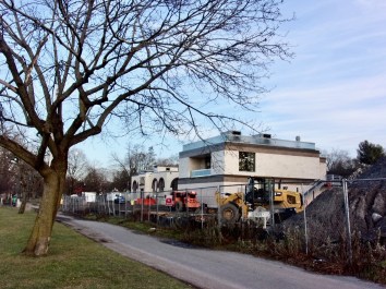 View from the East, December 20, 2021: The façade of the New Pump House has been moved much closer to the River, blocking the formerly expansive view of the West Lawn from east of the Old Pump House.