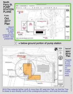More to the point, no one in the Stockade community, including the Board of the Stockade Association, had ever heard of a 3rd/Final Pump Station Plan. [As of May 15, 2020, you will still not find it on the Association’s Pump Station Documents Page.] The May 2019 plat shows the Pump Station moved perhaps 20 feet to the north and west of the October 2017 version, thus purportedly necessitating the removal of the Grand Old Tree and completely blocking view of the Old Pump House from the west. The “secret” May 2019 plan, which we never knew about, did indeed indicate the Tree’s removal (as I have noted in red on the image to the right of this paragraph, which compares the May 2019 plan to the last public plan in October 2017; click on the collage for a larger version).