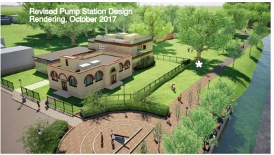 Another very important change in the May 2019 Plan is the moving of the new station to the north (closer to the River) so that it significantly blocks the view of the picturesque and beloved Old Pump House from the west. (The image to the right shows the last public renderings from October 2017, with the new station set back to keep the façade of the Old Pump House and a west-facing arched window in view from the west.) In an environmental impact assessment, obstructing the view of a Historic Resource or District is deemed an adverse impact that must be removed or mitigated. [see NYS Department of Environmental Conservation Visual Impact Assessment Policy (2000)] We were never told about, and so were not able to contest, what would be an irreversible loss if the May 2019 Plan is followed. - The State Historic Preservation Office [SHPO] okayed the October 2017 location and footprint of the project, based on the then-existing “site plan”, drawings and renderings for the project. However, it appears that SHPO never considered the new location of the Pump Station for the final GOSR Environmental Assessment (May 9, 2019) of the North Ferry St. Pump Station, which included no new renderings or sketches, but has a cover image that continues to show the new station set back south of the façade of the Old Pump House.
