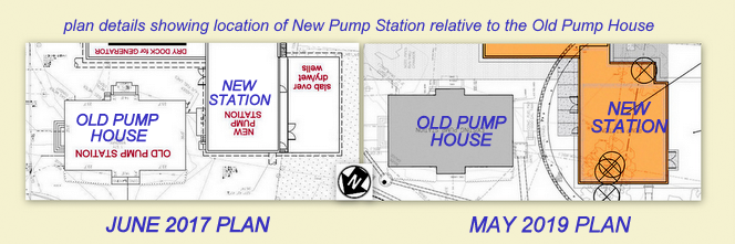 The footprint being constructed now of the New Pump Station purports to be based on an engineering plat from May 2019, which was never presented to the public nor City Council at that time; it was “explained” at an online City Council committees meeting in June 2020, which was prompted when the Grand Old Tree was cutdown on Earth Day 2020 (see my summary and comments). Here is my comparison of the May 2019 and June 2017 plans: