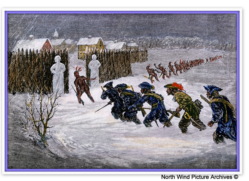 Our Header Image. The image used in our Header since January 2016 corresponds with the new name “snowmen at the gates,” and depicts the event that inspired the name. It was cropped from the hand-colored image on the right, and is from the collection of North Wind Picture ArchivesThe original black/white woodcut in North Wind’s archive is a “conjectural” illustration from a four-volume work by William Cullen Bryant and Sydney Howard Gay, “A Popular History of the United States, from the First Discovery of the Western Hemisphere by the Northmen, to the End of the Civil War” (New York: Charles Scribner’s Sons, c1876-1881).  Its original caption read: “The Attack on Schenectady.” We assume the original artist was an in-house illustrator for Scriber’s. The hand coloring was done by North Wind’s archivist, Nancy Carter.