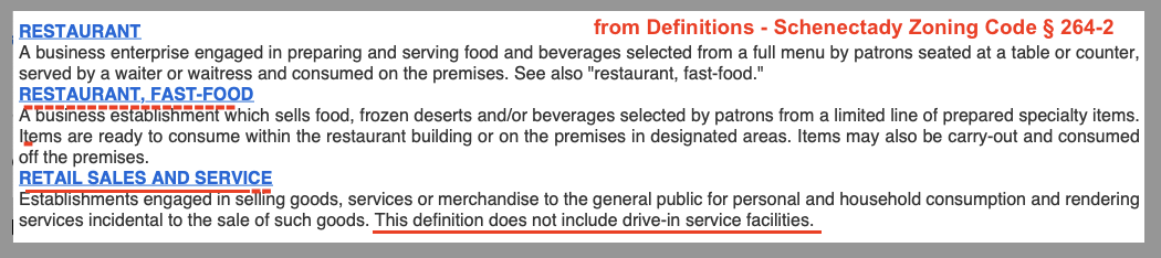 never looked at our other Schenectady Code provisions concerning drive-thrus, to help determine the overall intention of City Council. Such as, the broad definition of DRIVE-IN ESTABLISHMENT (which includes “facilities [that] . . . encourage or permit customers in vehicles to receive a service or obtain a product.”); or, the failure to mention drive-thrus in the Code’s definition of restauants and fast-food restaurants; nor, the explicit statement that the definition of Retail Sales and Services “does not include drive-in service facilities.” [see the thumbnail at the beginning of this sentence]- never mentioned plain meaning or dictionary meaning of the relevant words, which clearly belie the claim of uncertainty.