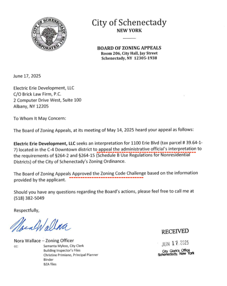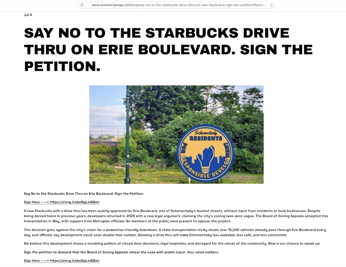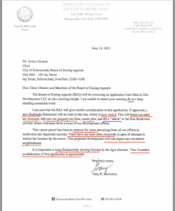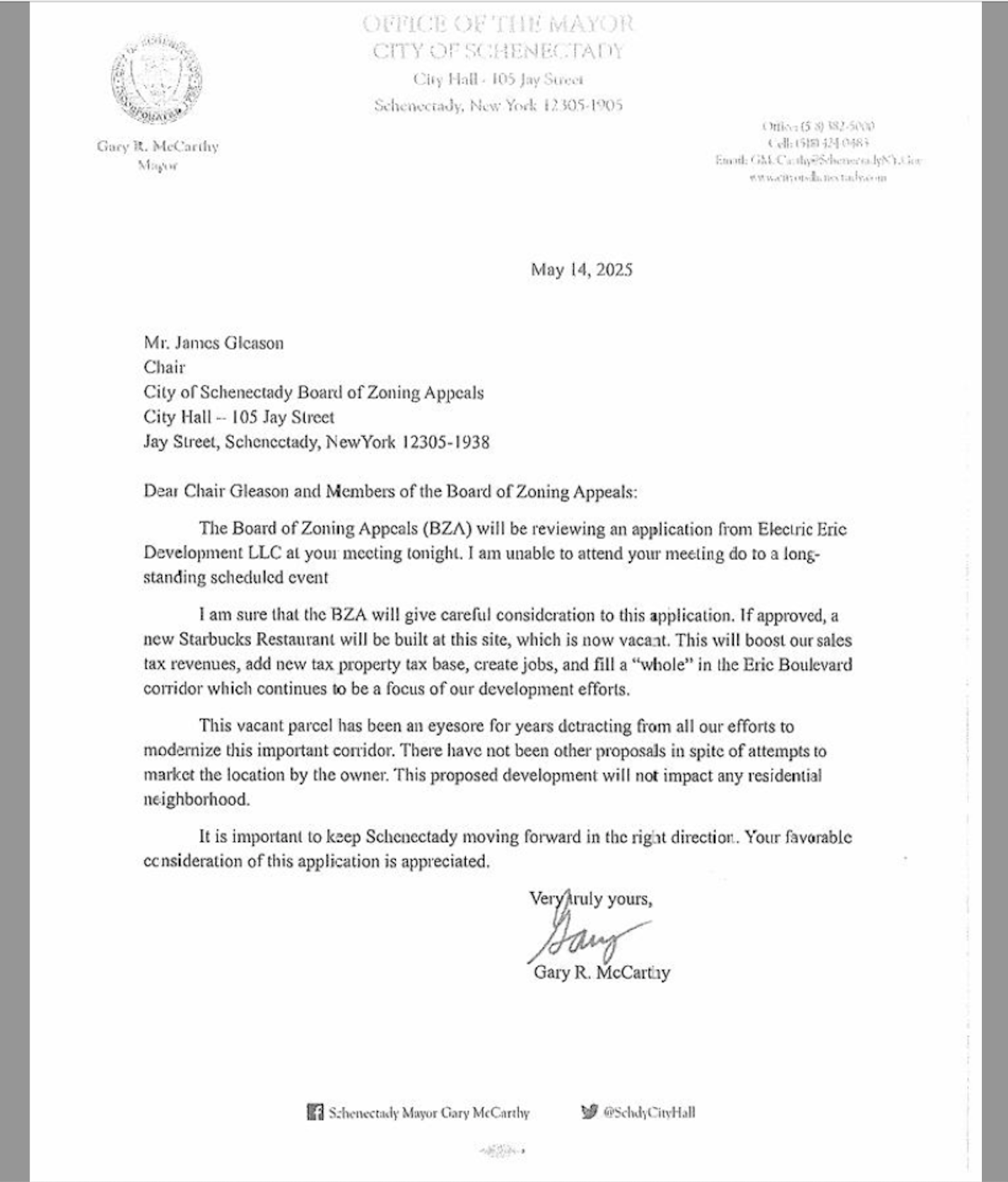 . . Click on its thumbnail image to the left to see Mayor McCarthy’s unusual and inappropriate letter to the Zoning Board of Appeals, dated May 14, 2025, the very day they were to decide on the EED request to build the Starbucks with drive-thru at 1100 Erie Boulevard. Filled with distractions and half-truths, and never mentioning traffic, safety, or a drive-thru, the letter ends saying “Your favorable consideration of this application is appreciated.”