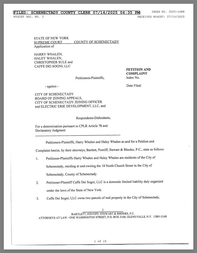 - The Zoning Board of Appeals [“ZBA”] decision on May 14, 2025 granting the application by Electric Erie Development, LLC [“EED”] to build and operate a Downtown Starbucks with a drive-in window was not simply undesirable or unfair, it was “ultra vires”, beyond the authority of the Board. [For factual background, see Daniel Flynn’s Guest Column in the Gazette, “Bending rules for Starbucks would set bad precedent” (Sept. 17, 2025, p. 4, e-edition link.] As explained in this posting, I believe the ongoing court proceeding challenging the ZBA decision (click to read the Art. 78 Petition) should and will reverse the ZBA decision that permits a drive-in facility in Downtown Schenectady.